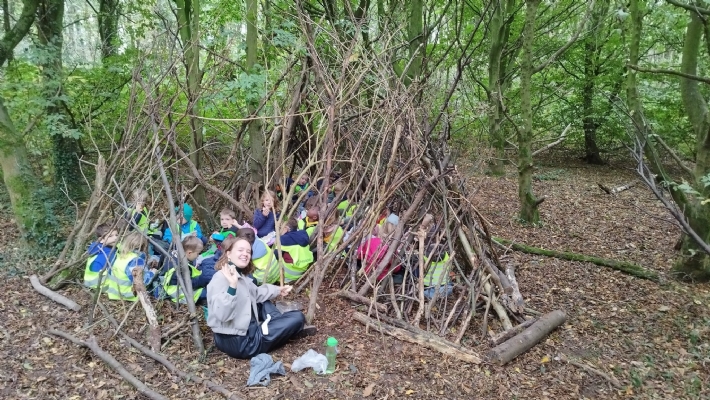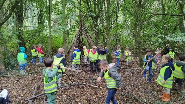 Daarna voerden we Sem zijn idee uit: een kamp bouwen waar we met de héle klas in konden eten. Dat bleek een stevige klus! Er werd hard gewerkt, gezwoegd en soms een beetje gezweet. Gelukkig stonden er ook stille helpers paraat, die zelfs een ziekenhuis openden voor wie een “wonde” opliep tijdens het bouwen.