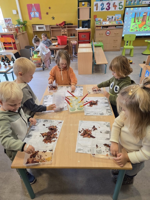 We bestempelden kleurrijke herfstbladeren, kleefden echte blaadjes en geven paddenstoelen vrolijke stippen. Daarnaast maakten we ook heerlijke egeltjes— wat een feest voor alle zintuigen! 🦔✨