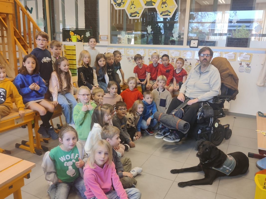 Vandaag kregen we bezoek van Marijn en zijn hulphond. Hij vertelde ons wat een hulphond allemaal kan en hoe zo’n hond zijn baasje helpt in het dagelijks leven. We leerden dat hulphonden heel goed getraind zijn en dat ze echt een groot verschil kunnen maken. De hond liet ons zien wat hij allemaal kon. Iedereen was natuurlijk erg benieuwd naar de naam van de hond, maar dat bleef een groot geheim!