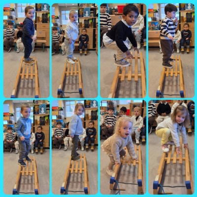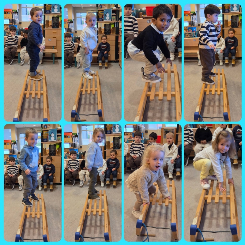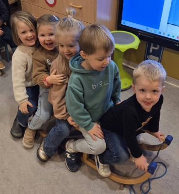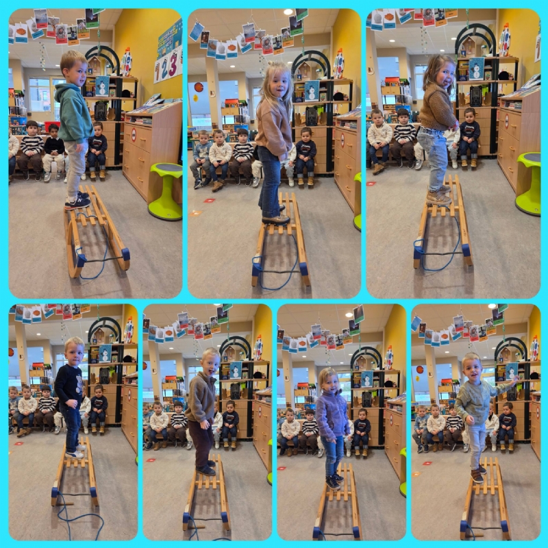We leerden nieuwe begrippen aan via spel, onder andere met de slede, en probeerden samen met zoveel mogelijk vriendjes op één slede te zitten – wat een plezier!
