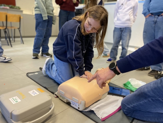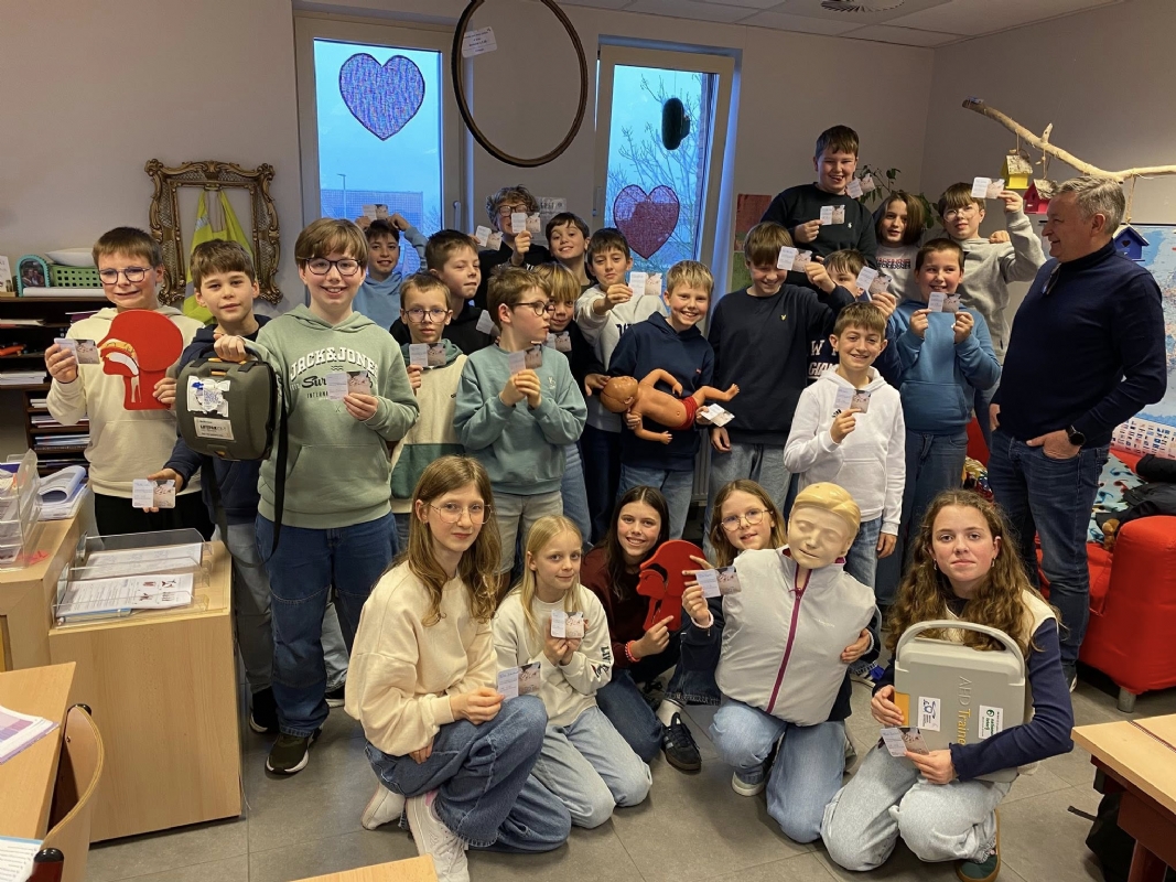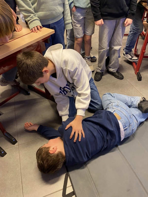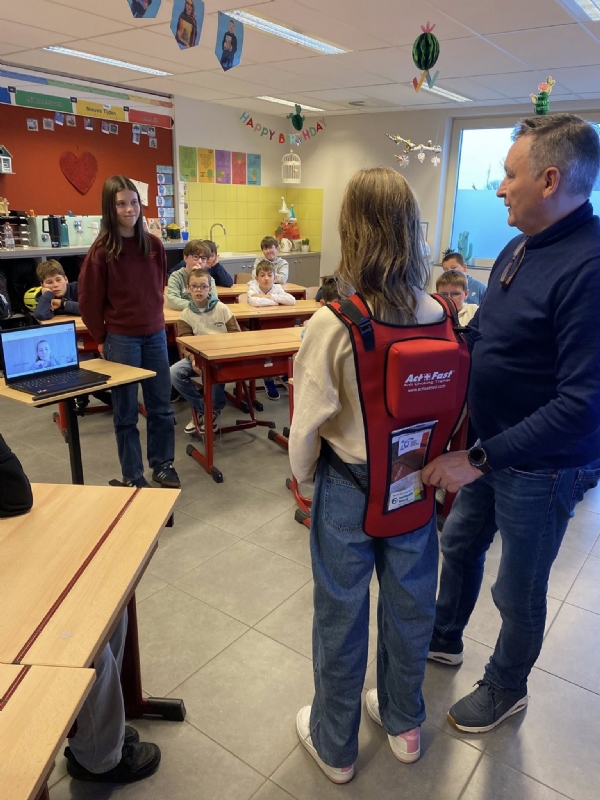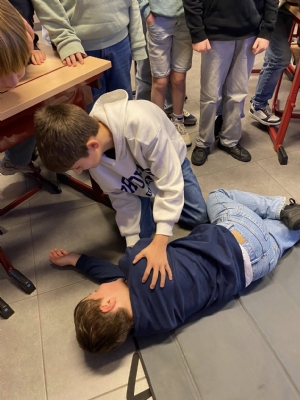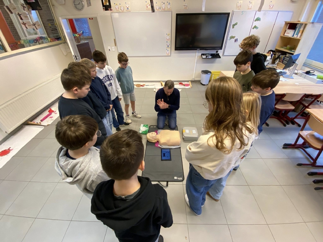 Geert Sabbe, een MUG-verpleegkundige met maar liefst 40 jaar ervaring, kwam een workshop geven in het zesde leerjaar. Geert deelde zijn kennis over Eerste Hulp Bij Ongelukken, reanimeren en het gebruik van een AED-toestel. De leerlingen leerden hoe belangrijk het is om in een noodsituatie snel en correct te handelen. Hij benadrukte het belang van elke seconde die telt bij het redden van levens, vooral in situaties waarbij reanimatie nodig is. De leerlingen kregen niet alleen theoretische informatie, maar ook praktische tips en uitleg over het gebruik van een AED, zodat ze weten wat ze kunnen doen in geval van een noodsituatie. Misschien wakkerde hij bij enkele leerlingen het vuur aan om later zelf hulpverlener-ambulancier te worden?
